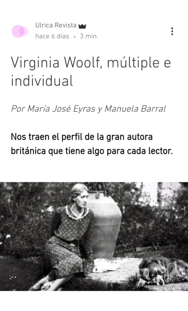 Virginia Woolf, múltiple e individual. María José Eyras y Manuela Barral. Revista Ulrica, Octubre 2020. Publicado el noviembre 6, 2020noviembre 6, 2020 por mariaeyras https://www.ulricarevista.com/post/virginia-woolf https://www.ulricarevista.com/post/virginia-woolf Comparte esto: Compartir en X (Se abre en una ventana nueva) X Compartir en Facebook (Se abre en una ventana nueva) Facebook Me gusta Cargando...